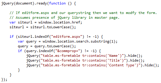 When you click on the button, the feature collects the selected items and builds a list of the common fields. It then opens the property editor. We’re using the native editform.aspx page (unmodified) and some jQuery to hide the unwanted fields: