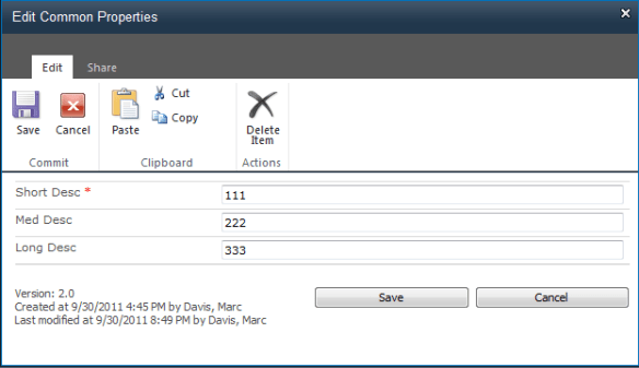 Make your changes and click ‘Save’. An event handler for itemUpdating takes care of the changes. The selected documents properties will be updated accordingly: