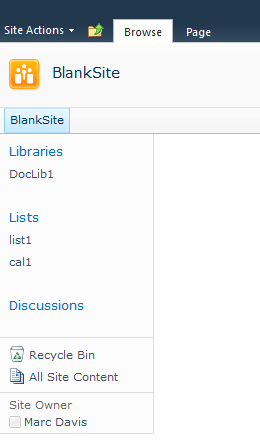 Hi Everyone. Work is nearly complete on the Site Owner control for SharePoint 2010. This solution will allow administrators to designate one user as a site’s ‘Owner’. The owner’s name will appear on each page at the bottom of the left-navigation (see screenshots below). The left-nav was chosen as it should be present on most intranet layouts. We’re inheriting the CSS of the left navigation too – so if you’ve branded your site the control will honor it. Also thinking about offering another spot to display the Owner’s name – or providing variables where you can plug the name into your branding as you see fit.