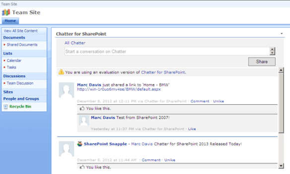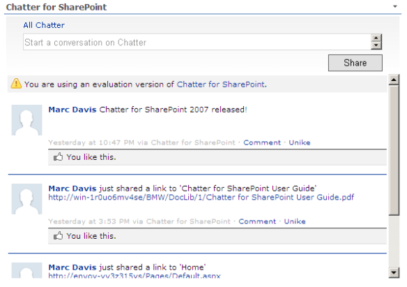 Hi Everyone – I am very pleased to announce that the new 2007-compatible version of Chatter for SharePoint is now available! You can download the latest version here. To my knowledge, this is the only solution that integrates SalesForce Chatter with SharePoint 2007.
