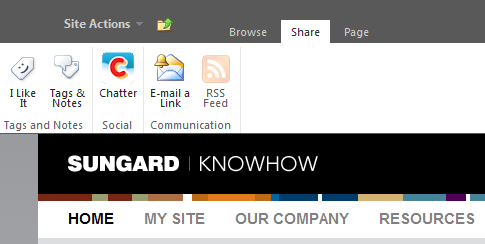 Hi everyone – sorry it’s been awhile between posts but got really busy at the end of the year. This article continues my series on SunGard’s corporate Intranet and the custom development we’ve done. As we were designing the branding we had some challenges around where to put some of the native controls and ribbon elements – especially two in particular: ‘Tags and Notes’, and ‘Like’. Since we effectively hid the ‘Browse’ tab, those default ribbon icons were MIA – but we didn’t want to lose that functionality. Another tab in the ribbon seemed the most logical place, and would serve as way to integrate other social aspects into SharePoint.