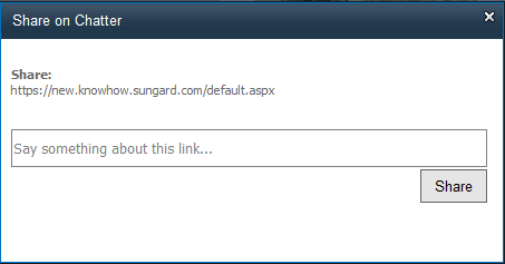 When SunGard standardized on Chatter as their social platform, the focus became integrating Chatter into SharePoint as seamlessly as possible. We’ve approached this process in stages. The first stage was basic integration – common authentication, status updates, and shaing pages, documents, and list items. The first phase was achieved with the Share on Chatter feature in the ribbon, and a custom web part for posting status updates (detailed later in this post).