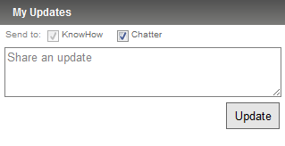 This web part is placed in everyone’s Sidebar (see: https://marcrdavis.wordpress.com/2011/09/27/persistent-personalized-content-in-sharepoint/ for details on the Sidebar) making it quick and easy to post updates. The user’s posts are sent to their SharePoint profile as well as posted on their Chatter feed.